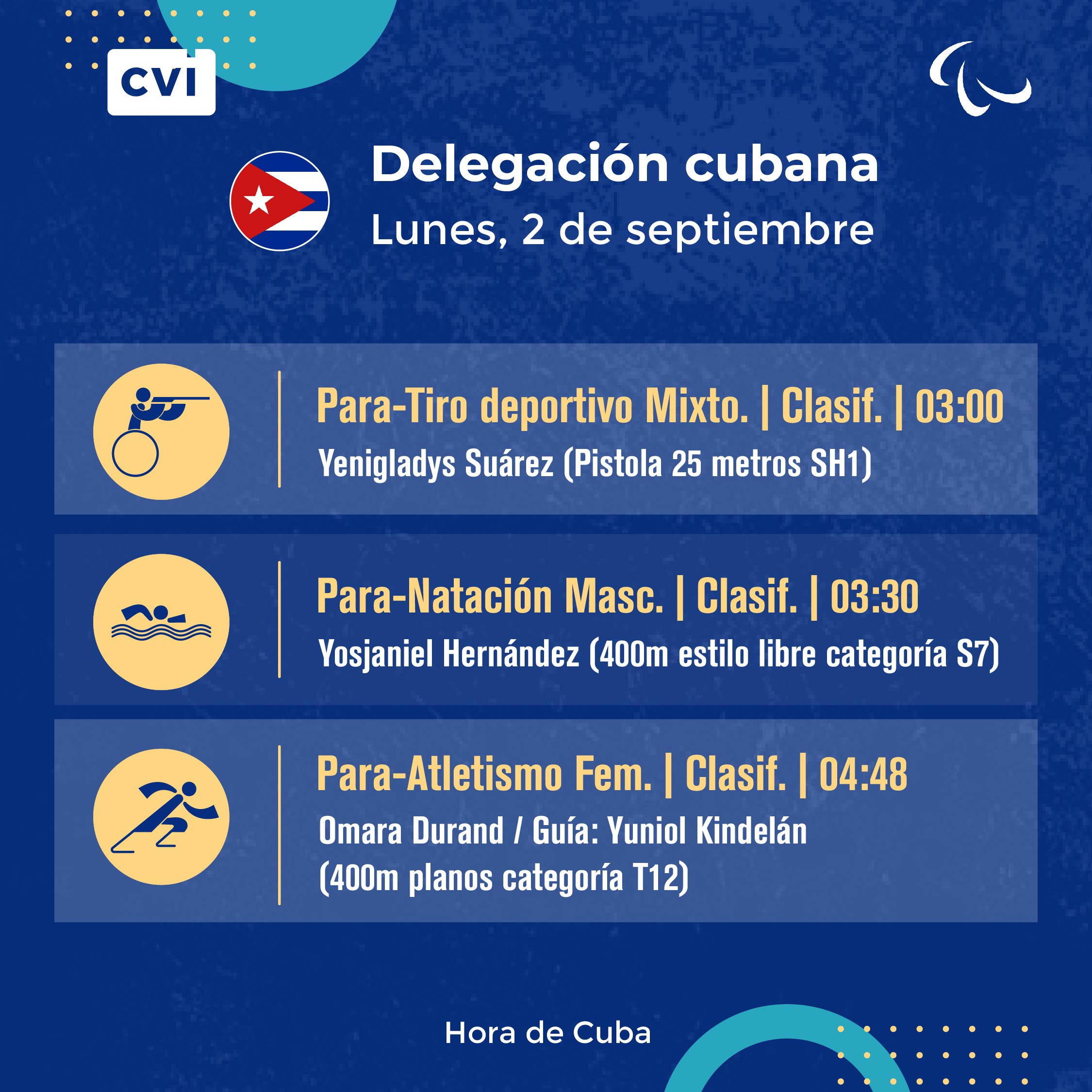 Para la próxima jornada se espera que la delegación cubana estrene su casillero dorado en el medallero de esta cita paralímpica, cuando disputen sus finales la reina cubana de las pistas Omara Durand junto a su guía Yuniol Kindelán en los 400 metros categoría T12, el recordista mundial y actual campeón paralímpico del salto de longitud categoría T47, Robiel Yankiel Sol; así como el actual campeón mundial en este 2024 del lanzamiento de la jabalina categoría F46, Guillermo Varona.