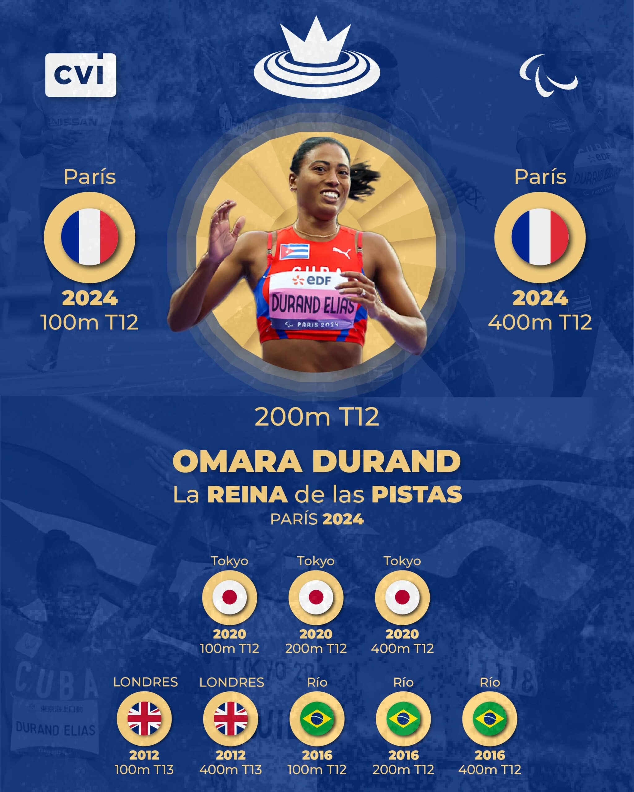 En esta jornada, Omara Durand se coronó en los Juegos Paralímpicos de París 2024 junto a su guía Yuniol Kindelán. Su actuación sumó la sexta presea dorada para Cuba en la urbe parisina. Entre lágrimas de felicidad y sonrisas de orgullo, con tiempo de 23.62 segundos en los 200 metros planos categoría T12, su presentación en esta final puso fin a un tránsito histórico por las pistas paralímpicas.