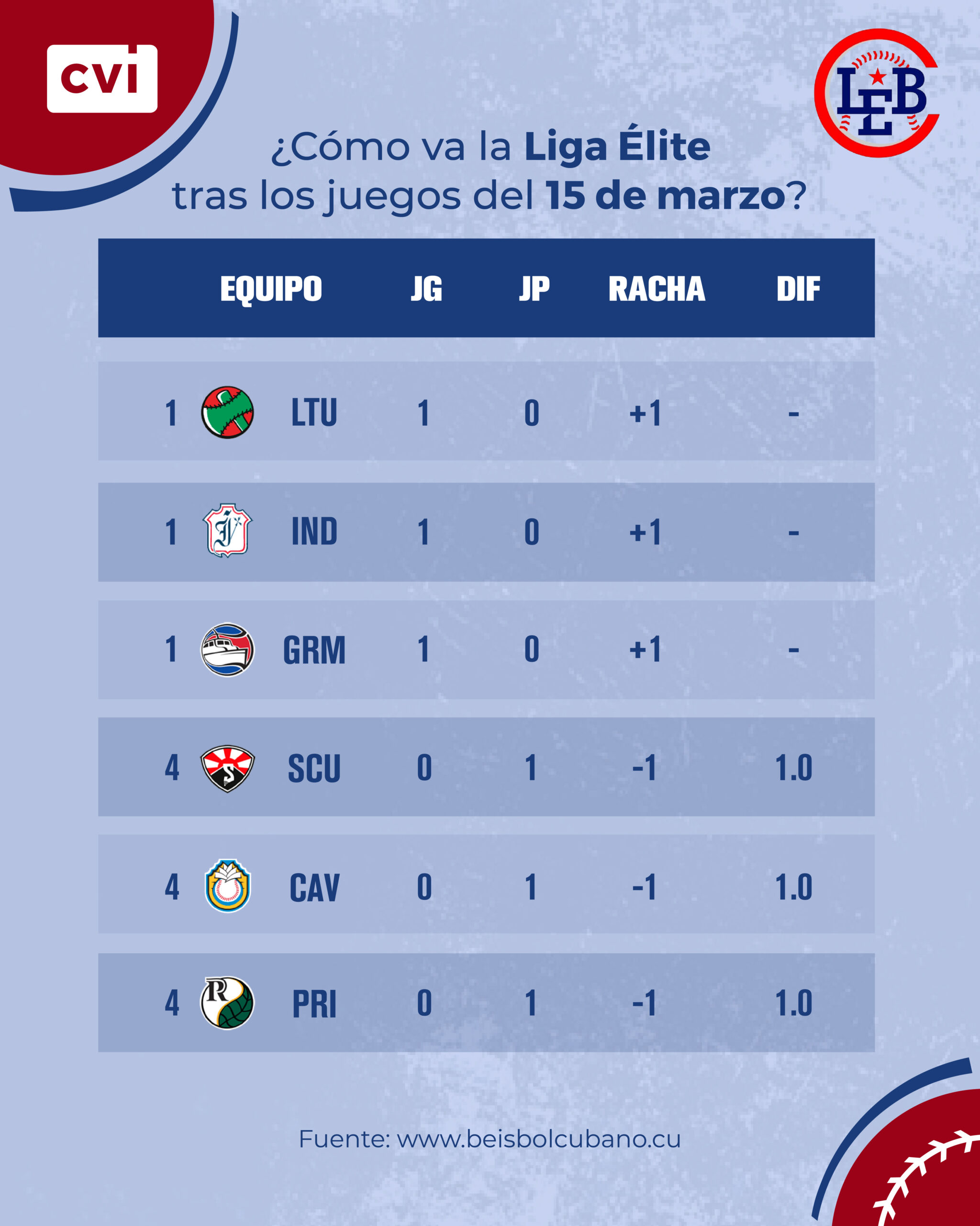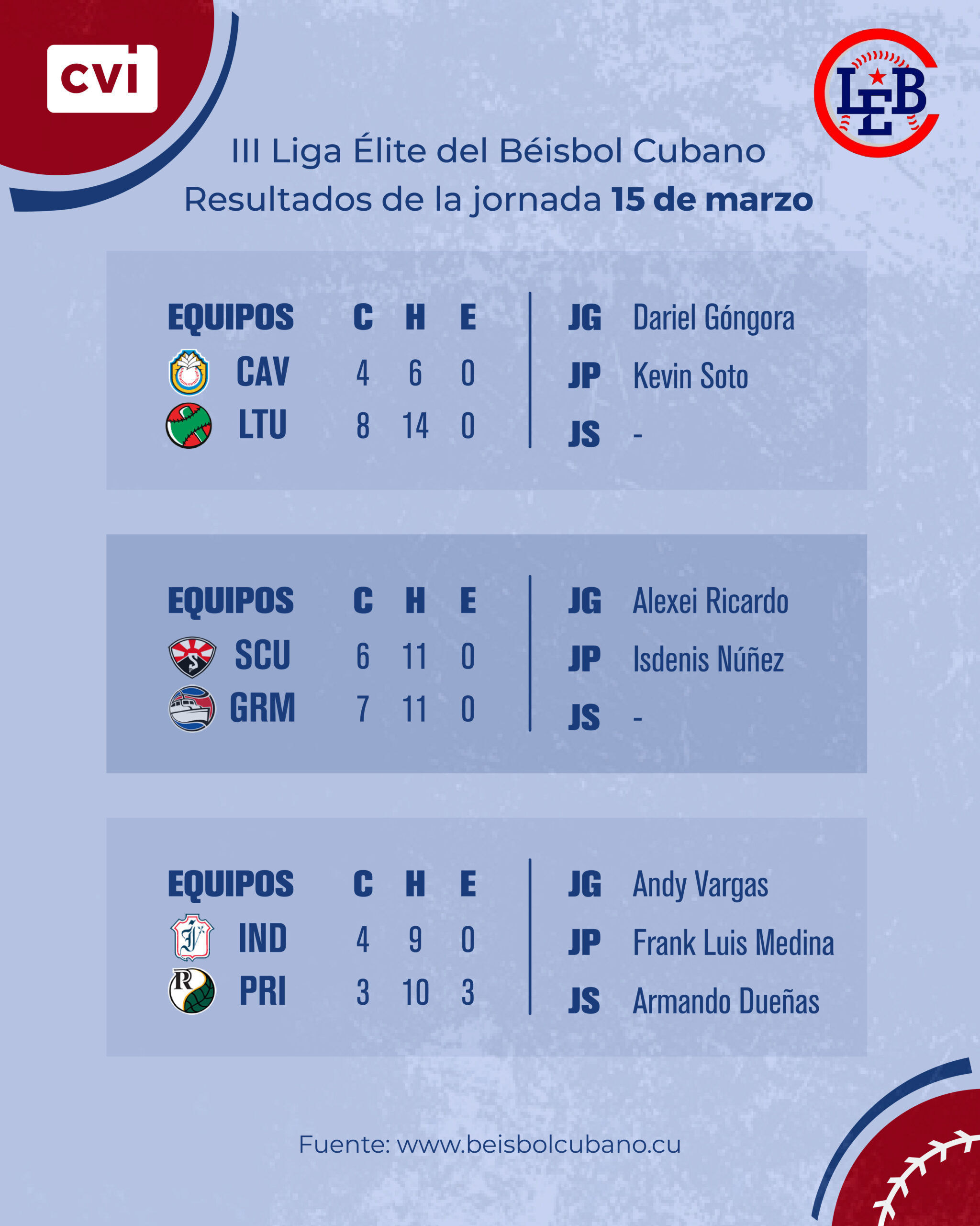Dennis Laza impulsó dos carreras a la cuenta azul y Frank Luis Medina fue el derrotado, tras permitir dos carreras limpias de cuatro en 6.1 capítulos; es válido señalar que la defensa pinareña cometió 3 errores.