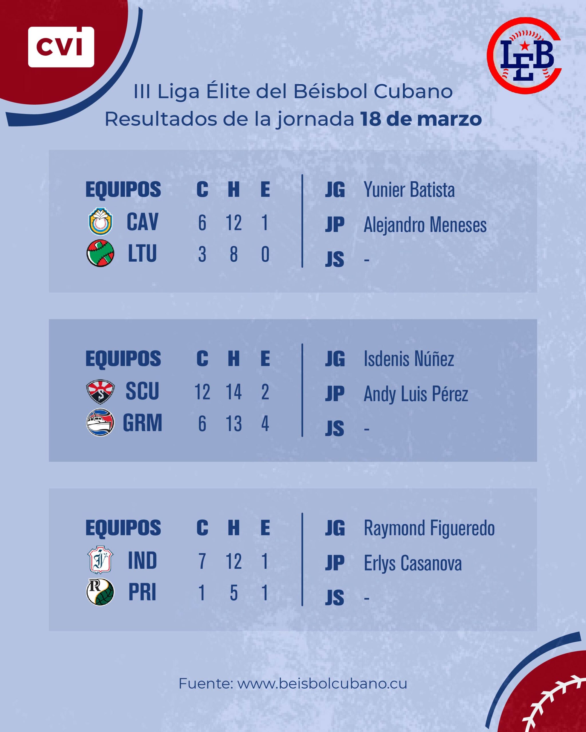 Eduardo García impulsó cuatro carreras y se reafirmó como el líder del torneo con 11. El choque lo ganó Isdenis Nuñez y lo perdió Andy Luis Pérez.