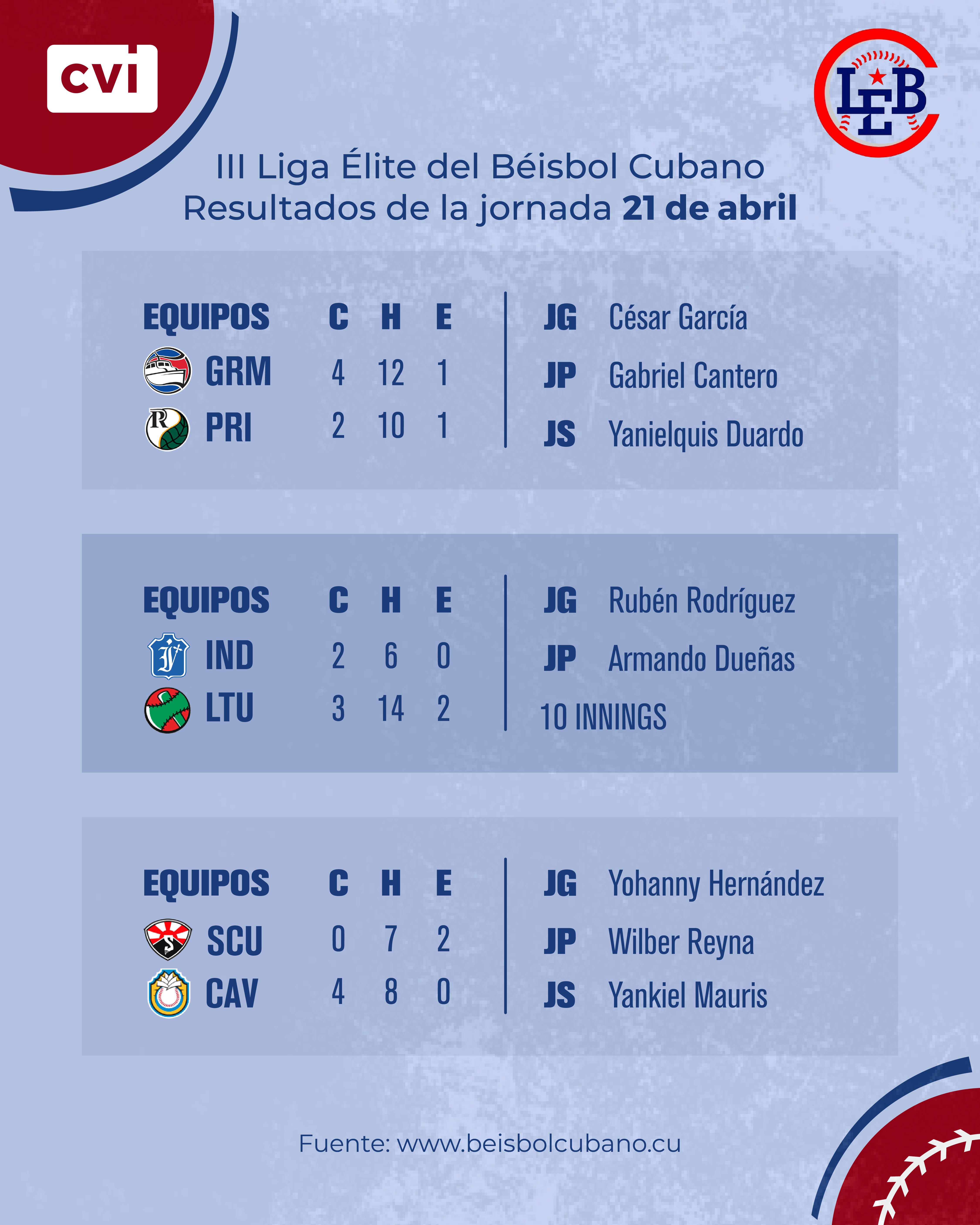 Ofensivamente sobresalieron por los tuneros Jean Lucas Baldoquín con 3 jits en cuatro turnos al bate, Yosvani Alarcón con dos imparables y Yunior Otero con un incogible y par de anotaciones impulsadas.
