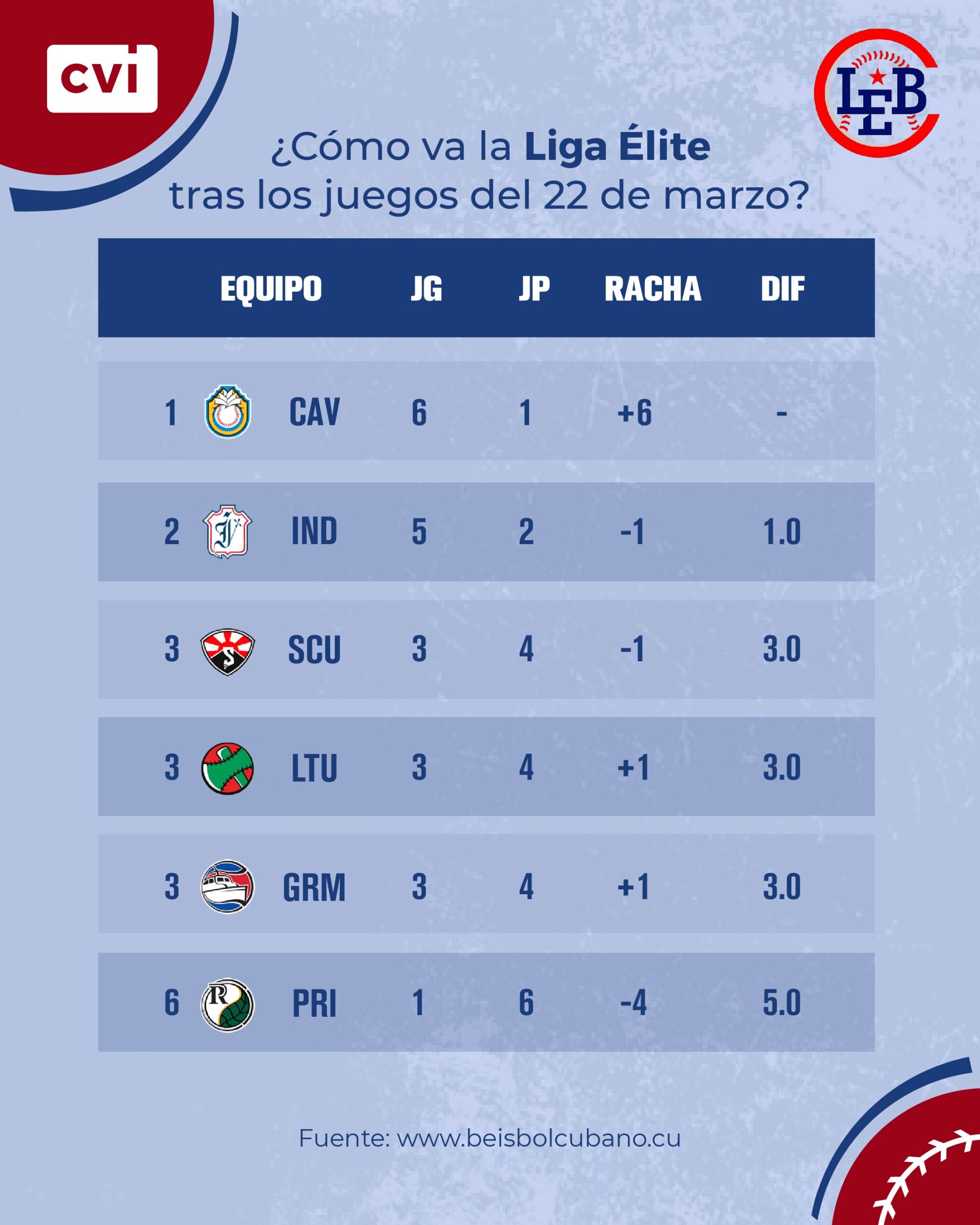 -Ciego de Ávila tiene la mejor racha del torneo (seis victorias consecutivas) y Pinar del Río la peor (cuatro derrotas consecutivas).