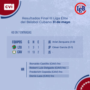 Por los derrotados, Lázaro Ponce se fue de 1-2, con una carrera impulsada y, el abridor César García cargó con la derrota tras tolerar seis carreras en tres entradas de labor.
