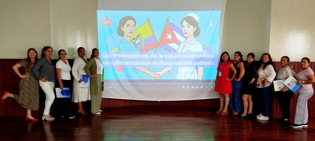 Bajo la consigna «Las trabajadoras de la salud ecuatoriana se solidarizan con la clase obrera cubana», en el Hospital Marco Vinicio Iza de Lago Agrio, dirigentes de los sindicatos de Sucumbios que forman parte del Sindicato Nacional de Auxiliares de Enfermería del MSP, durante la Escuela Política Pedro Saad, llevaron a cabo un emotivo acto de respaldo a la clase trabajadora cubana.