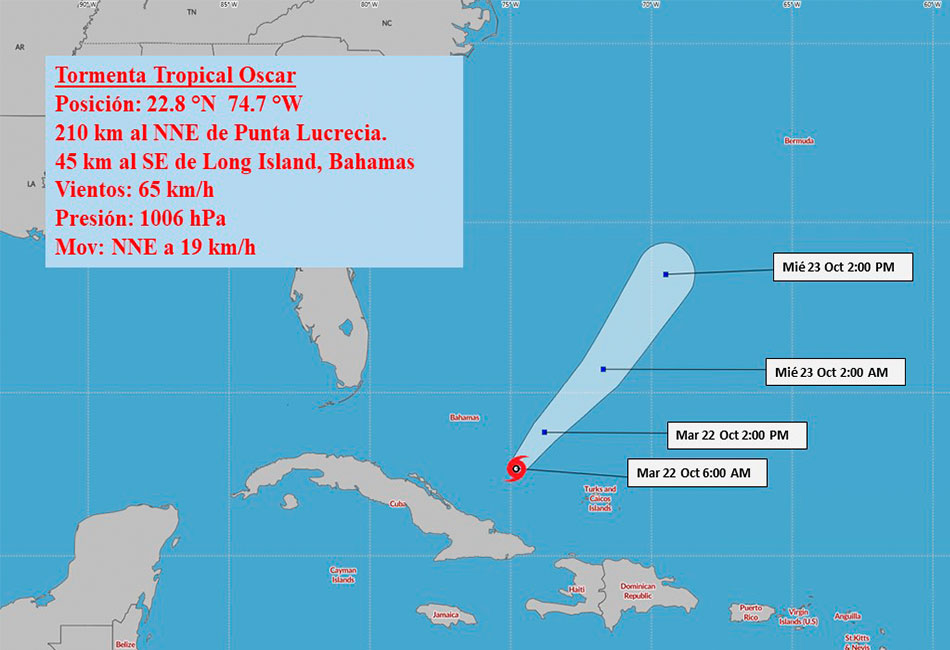El Centro de Pronósticos del Instituto de Meteorología (INSMET) de Cuba informó que la tormenta tropical Oscar se mantiene con poco cambio en intensidad, alejándose del territorio nacional.