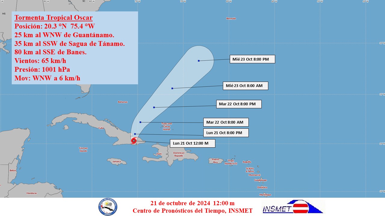 Debe prestarse la mayor atención en las provincias orientales a la evolución y futura trayectoria de la tormenta tropical Oscar, en particular a la ocurrencia de lluvias intensas, que pueden provocar inundaciones en estas provincias.