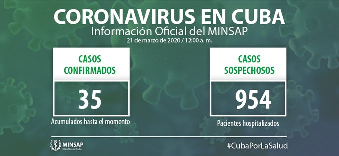 El ministerio de Salud Pública de Cuba en su cuenta en Twitter informó que al cierre del sábado 21 de marzo se confirmaron 10 nuevos casos, para un acumulado de 35 en el país.