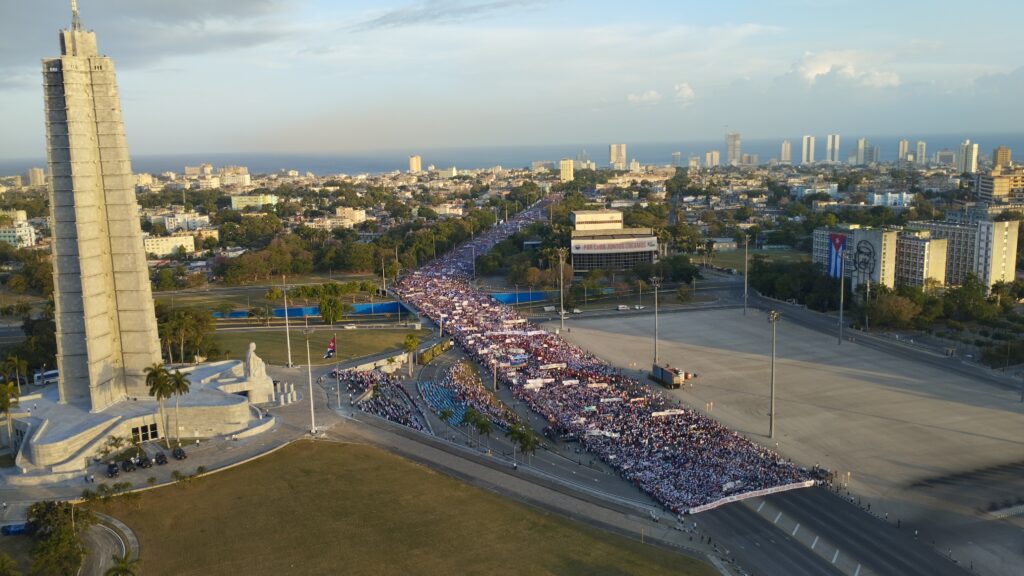 Son las banderas que no se rinden, las de la patria cubana, las del movimiento obrero, las del socialismo que defendemos a cualquier precio. Es el sol naciendo sobre los rostros curtidos por el trabajo y la esperanza. Es el pueblo cubano, entero, a lo largo y ancho de todo el país, que no camina por costumbre. Camina porque cree.