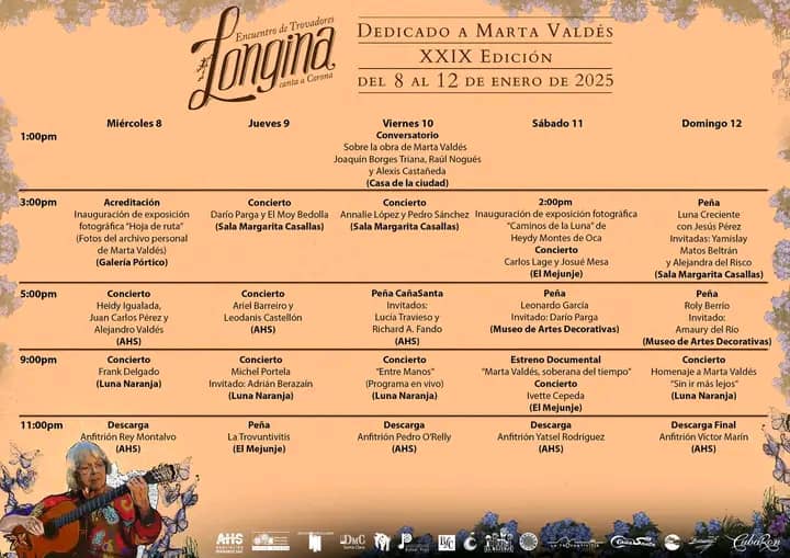 Con el concierto del trovador Frank Delgado el miércoles 8 de enero en el Centro Cultural La luna Naranja, de Santa Clara, iniciará la XXIX edición del Festival «Longina canta a Corona», con dedicatoria especial a Marta Valdés, compositora e intérprete de icónicas canciones en la memoria musical de la Isla.
