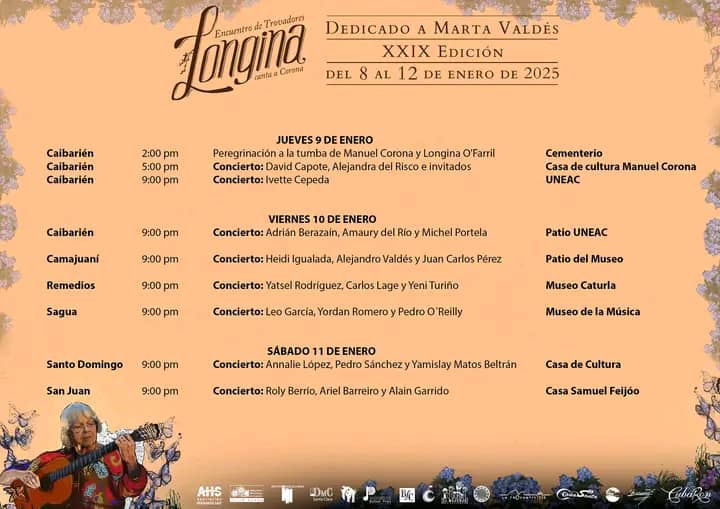 Si bien los espacios fundamentales de la cita trovadoresca son instituciones santaclareñas, el 10 de enero llegará a espacios de otros municipios villaclareños, como Caibarién, Remedios, Camajuaní, Santo Domingo, Sagua la Grande y Ranchuelo.