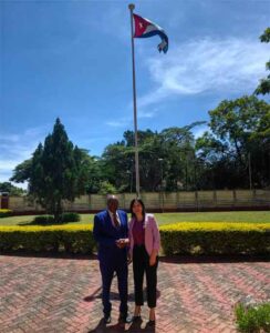 La Embajadora de Cuba en Zimbabwe, Susellys Perez Mesa, intercambió este 7 de abril sobre las potencialidades de cooperación con el Presidente del Instituto de la Diplomacia de Zimbabwe, Vova Abednigo Chikanda.