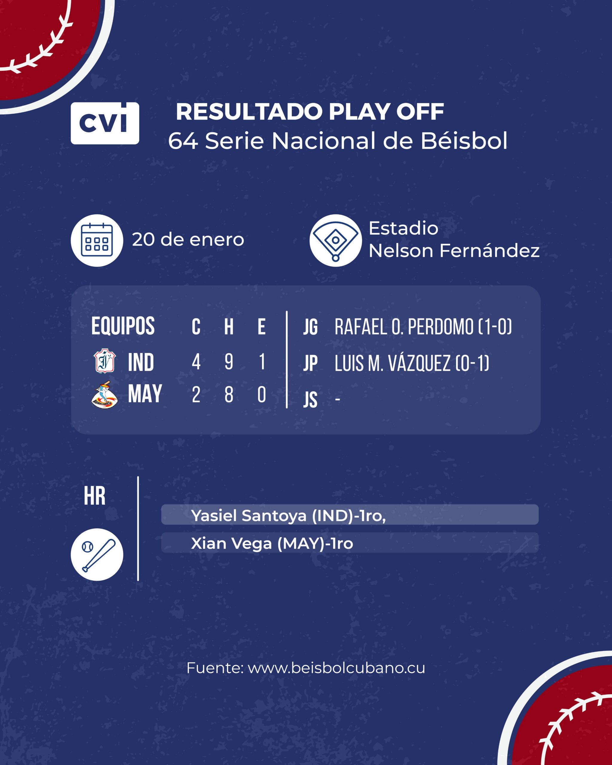 En el desafío pegaron jonrones Xian Vega, por los mayabequenses, para inaugurar el marcador en el quinto episodio y Yasiel Santoya en el séptimo inning para igualar las acciones en ese momento.