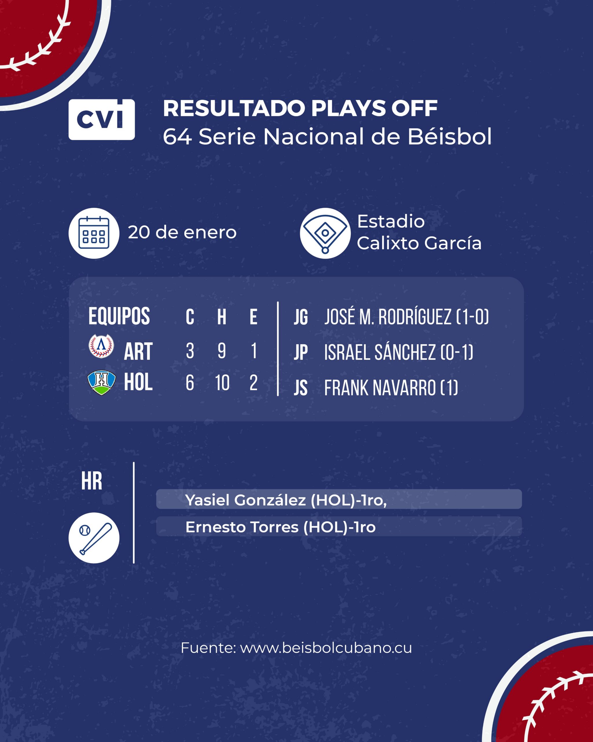 En el «Estadio Calixto García», que acogió a miles de aficionados para presenciar este primer desafío de la postemporada, los Cachorros de Holguín concretaron un disputado triunfo 6-3 ante los Cazadores de Artemisa, en un choque que se mantuvo cerrado hasta el séptimo inning, cuando los locales lograron marcar la diferencia con una oportuna ofensiva.